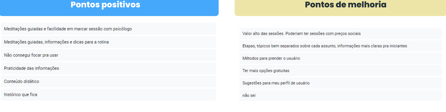 Procuramos entender o que os participantes gostaram e o que poderia melhorar nos aplicativos de saúde mental que já usaram: