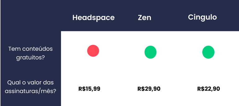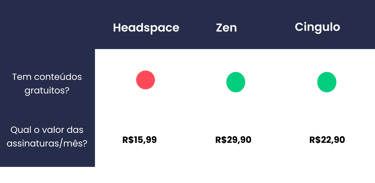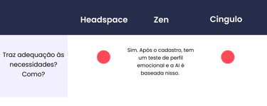 No formulário, alguns participantes relataram o uso de aplicativos de saúde mental, como o Headspace, Zen e Cingulo. Realizei análises desses 3 apps, cujo objetivo é identificar padrões para obter insights para o desenvolvimento do Calm Mind.
