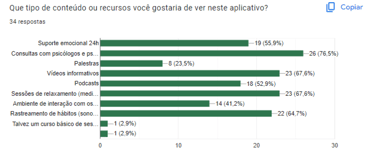 Também procuramos entender que tipo de conteúdo ou recursos os participantes gostariam de consumir no aplicativo. Obtive os seguintes resultados: