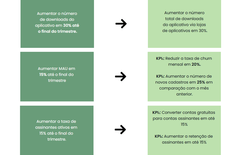 Pensando também em objetivos do negócio, propus os seguintes OKRs e KPIs:
